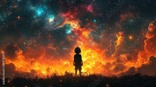 A child silhouetted against a sky of multicolored galaxies, solid background