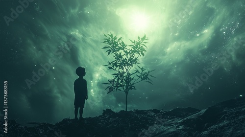 A child stands by a tree under a glowing sky, symbolizing hope and future growth.