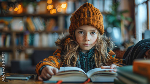 A child studying at home, surrounded by books and educational tools, with a parent assisting