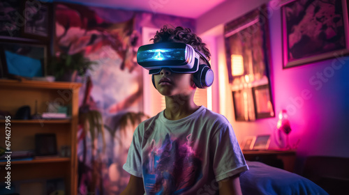 A child wearing VR headset, stands in living room, enjoying a virtual reality experience with joy. Concept of future and tech. Ai generative