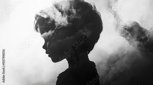 A child with a magical ability to shape shadows in an eerie double exposure blending with dark silhouettes and mysterious forms