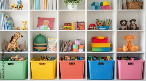 A childas playroom shelf filled with colorful bins, toys, and books.