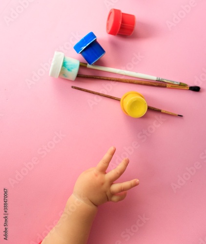 a child's hand holds brushes and paints on a pink background top view with space for text