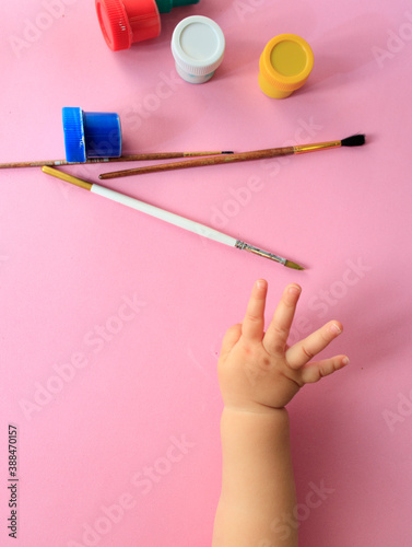 a child's hand holds brushes and paints on a pink background top view with space for text