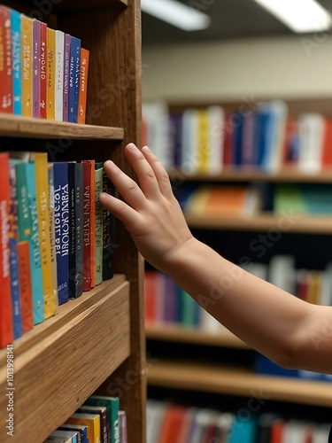 A child’s hand reaching for a book on a shelf in a library.