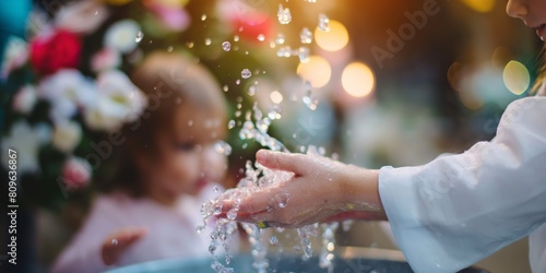 A child's hands play gleefully with water splashes under colorful blurred lights, symbolizing youthful joy
