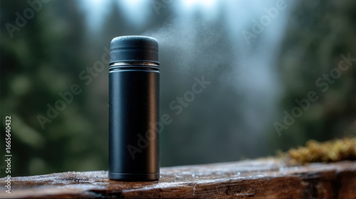 A chilled thermos with visible cold mist and water droplets, sitting on a rustic wooden surface, with blurred forest background