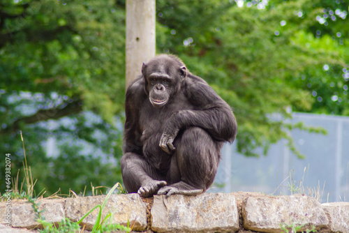 A chimpanzee sitting in Whipsnade Zoo looking at the camera