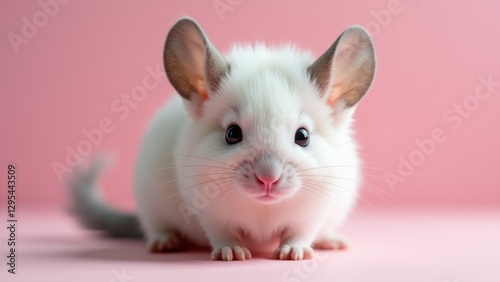 A chinchilla baby with large ears and fluffy fur is sitting on a pink background.