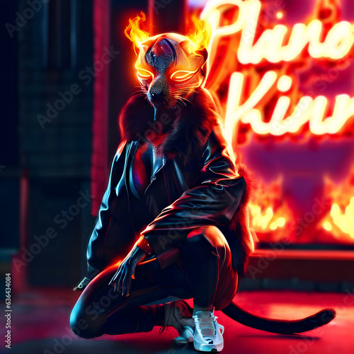 A chiniess fox in a leather jacket stands in the street in front of a neon sign