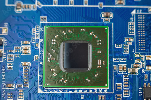 a chip in a computer with many electrical elements, a CPU, a GPU, a microchip in an electronic device, a multi-core multithreaded processor crystal, close up, macro