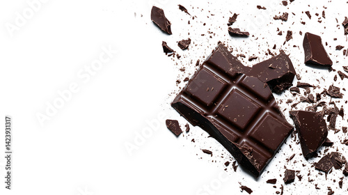 A chocolate bar is broken into pieces and scattered on a white background