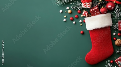 A Christmas stocking filled with gifts and treats, hanging against a green background, radiating holiday joy and festive cheer.