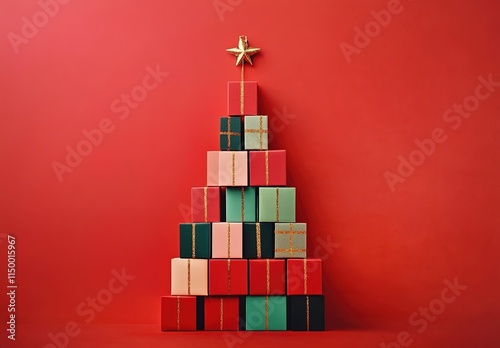 A Christmas tree made of stacked gift boxes on a red background with copy space, a minimalist concept for a holiday advertising banner or poster.
