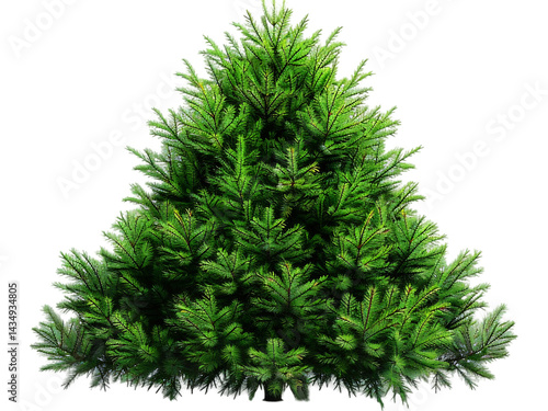 A Christmas tree with a triangular shape, featuring green branches that appear lush and full. The tree is set against a plain background, which emphasizes its vibrant green color and detailed foliage.