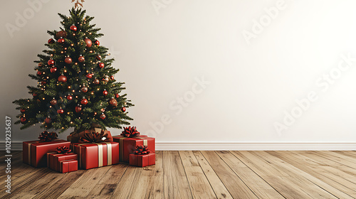 A Christmas tree with gifts on a wooden floor against a white wall, creating a festive background banner concept
