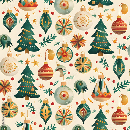 A Christmas tree with many ornaments and a star on top, pattern for gift wrapper