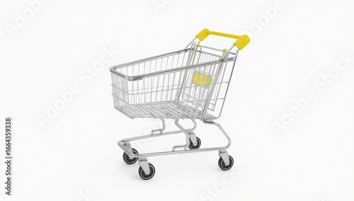 A chrome shopping cart with yellow handles is angled on a plain white background.