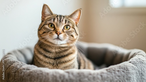 A chubby cat sitting upright in a cat bed, with a focus on its full body and content expression, set against a simple, comfortable backdrop.