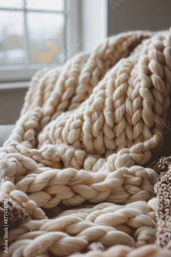 A chunky knit blanket with the words 'Egg Nog Day' knitted into it Hyper realistic. Shot with canon 5d Mark III --ar 2:3 --style raw Job ID: ca118ba2-18ff-4e1a-a953-77be690ab80f