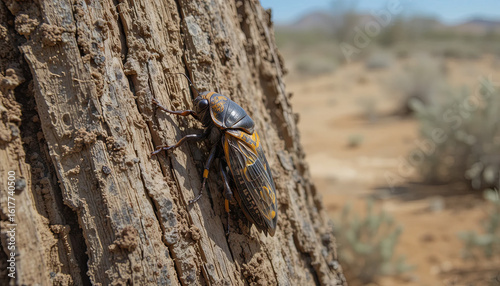 A cicada is resting on the rough surface of a tree trunk in a barren desert environment. The sun shines brightly, highlighting the cicada's vibrant colors against the dry backdrop