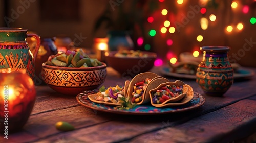 A Cinco de Mayo celebration featuring traditional Mexican pottery, festive lights, and a variety of fresh tacos on a table .