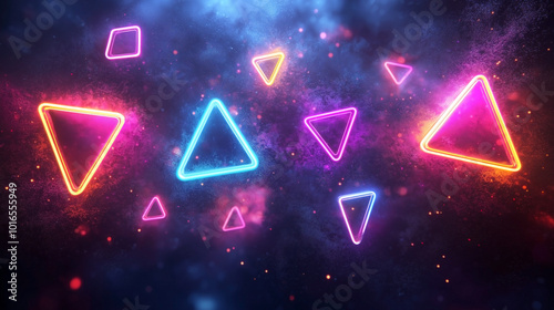 A cinematic abstract design featuring glowing neon geometric shapes floating against a dark background. The vibrant colors and soft lighting create a futuristic and artistic feel.