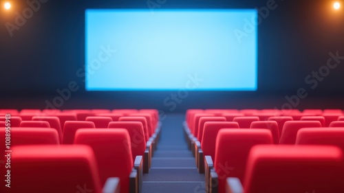 A cinematic interior featuring empty red seats facing a blank blue screen, creating an inviting yet quiet atmosphere.