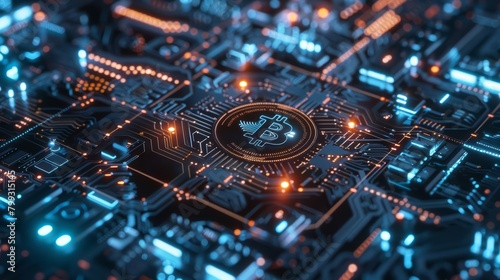 A circuit board with a glowing bitcoin in the center.