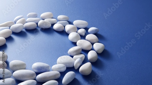 A circular arrangement of white pebbles on a blue surface creating a minimalist and serene composition