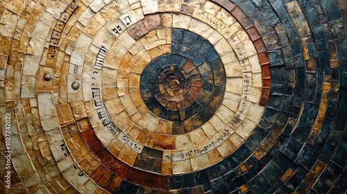 A circular mosaic pattern created from various pieces of wood, tiles, and paper in shades of brown, black, white, and blue, with a spiral pattern in the center.