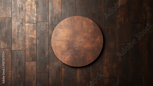 A circular signage mockup is displayed, elegantly hanging on a dark wooden wall.