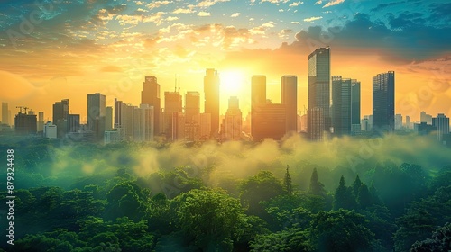 A city skyline bathed in the golden light of sunrise, with a lush green forest in the foreground