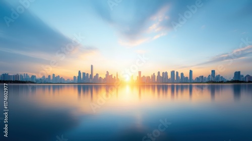 A city skyline is reflected in the water as the sun sets