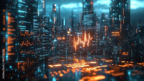 A cityscape with digital financial graphs overlaid, combining urban environment with financial analysis and modern technology.