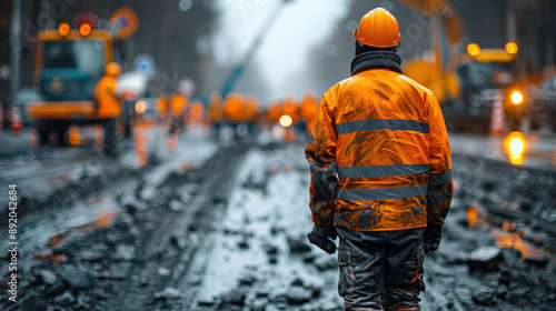 A civil engineer inspecting the foundation work for a new road, with an array of construction vehicles and workers in the background.