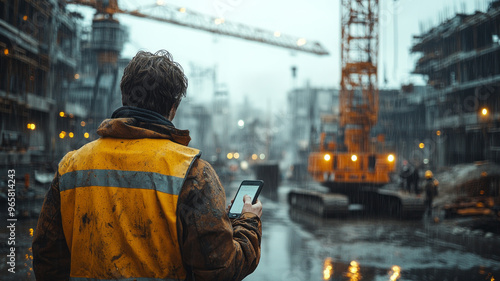 A civil engineer stands in the rain, phone in hand, overseeing a sunlit site.