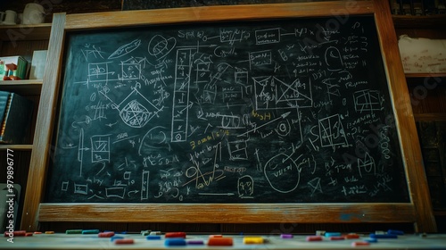 A classic black chalkboard with colorful drawings evokes nostalgia and creativity in warm light.