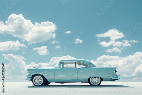 A classic blue automobile is parked under a vibrant sky filled with white clouds, radiating a peaceful, sunny atmosphere.