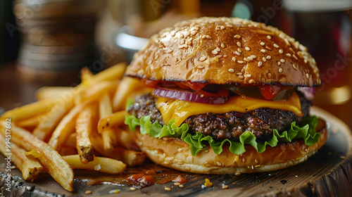A classic cheeseburger with a side of crispy fries, captured using an ultra HD camera with a ring light for even illumination