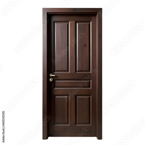 A classic dark wood paneled interior door with a brass handle, isolated on transparent background