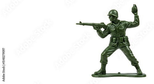 A classic green plastic toy soldier is captured in a dynamic action pose, aiming a rifle while preparing to throw a grenade.