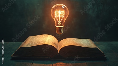 A classic open book with ancient pages, a futuristic neon light bulb levitating above, blending tradition and modern creativity, hyperrealistic, cinematic glow, 4K resolution