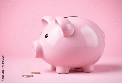 A classic pink piggy bank, slightly tilted, showcasing a coin slot and a few coins visible inside, future, savings