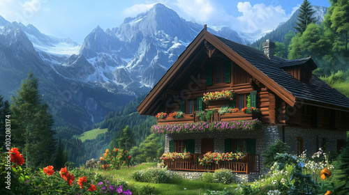 A classic Swiss chalet with dark wooden beams, a steeply sloped roof, and colorful flower boxes lining the windows.