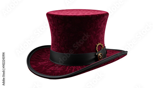 A classic top hat crafted from rich burgundy velvet, featuring a sleek black band and elegant gold detail.