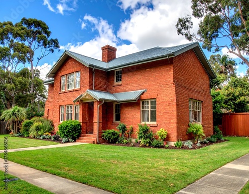 A classic two-story brick residence with lush green lawn, trees, and bright blue sky