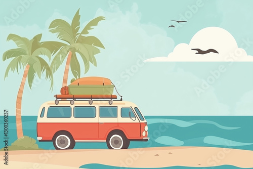A classic van sits parked on a tranquil beach under palm trees, ready for a coastal adventure.