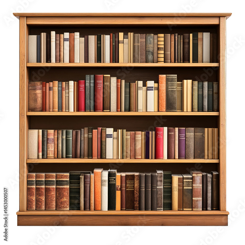 A classic wooden bookcase filled with various books, showcasing a diverse collection of literary works