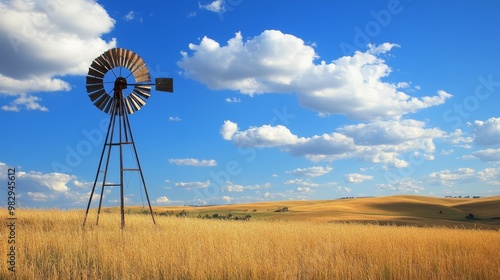 A classic wooden windmill stands tall in a field of golden rye, surrounded by rolling hills under a bright blue sky with fluffy clouds.